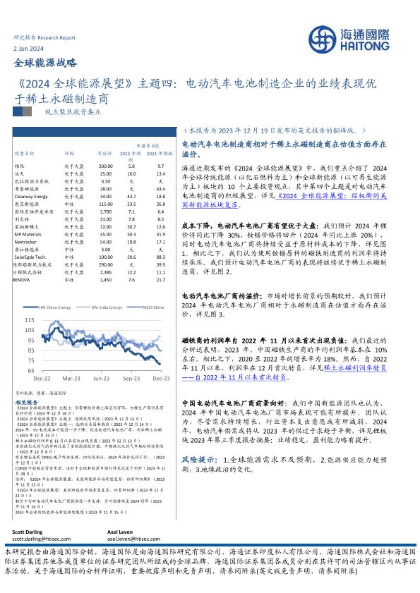 【海通国际】【20240103】《2024全球能源展望》主题四:电动汽车电池制造企业的业绩表现优于稀土永磁制造商-41页