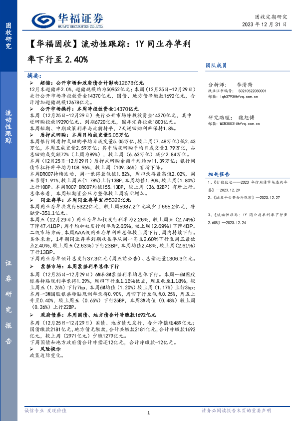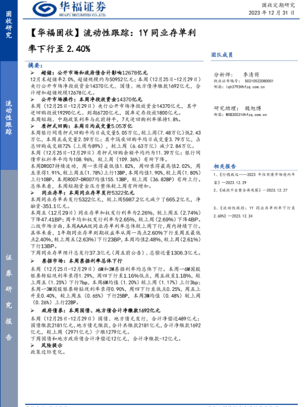 【华福证券】【20231231】【华福固收】流动性跟踪:1Y同业存单利率下行至2.40%-12页