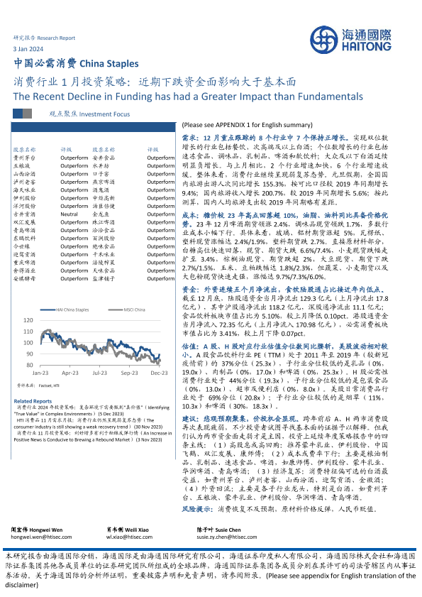 【海通国际】【20240103】中国必需消费:消费行业1月投资策略:近期下跌资金面影响大于基本面-47页