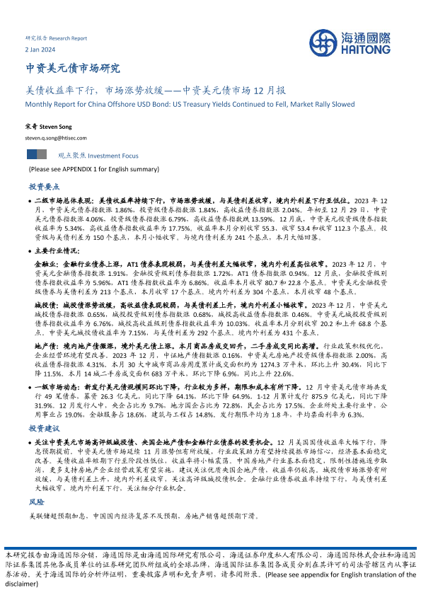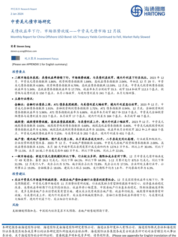 【海通国际】【20240102】中资美元债市场12月报:美债收益率下行,市场涨势放缓-20页