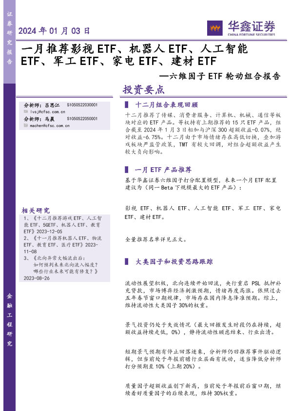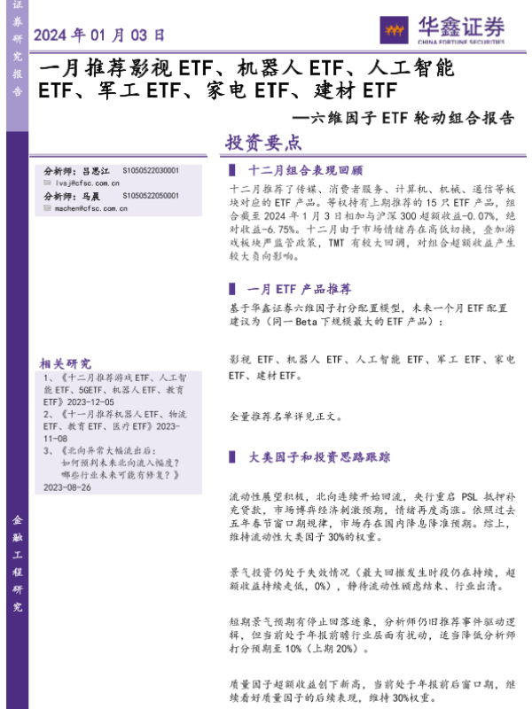 【华鑫证券】【20240103】六维因子ETF轮动组合报告:一月推荐影视ETF、机器人ETF、人工智能ETF、军工ETF、家电ETF、建材ETF-17页