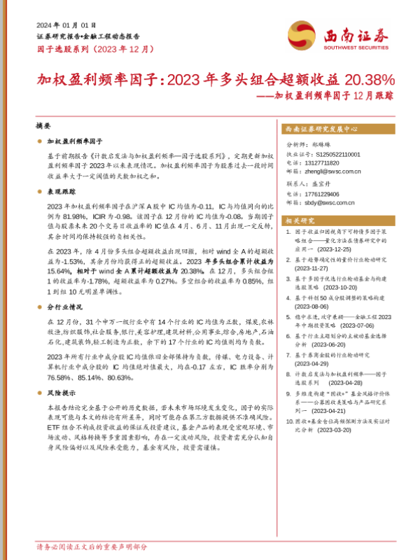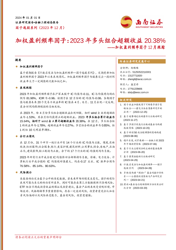 【西南证券】【20240101】加权盈利频率因子12月跟踪:加权盈利频率因子:2023年多头组合超额收益20.38%-11页