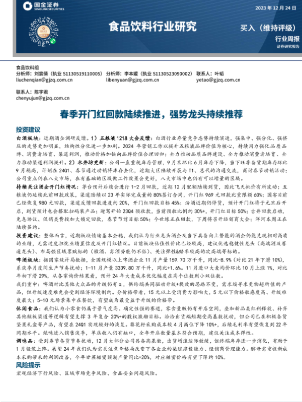 【国金证券】【20231222】国金证券:食品饮料行业研究-春季开门红回款陆续推进-强势龙头持续推荐-11页