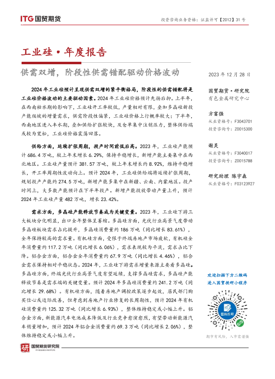 【国贸期货】【20231228】工业硅·年度报告:供需双增,阶段性供需错配驱动价格波动-18页