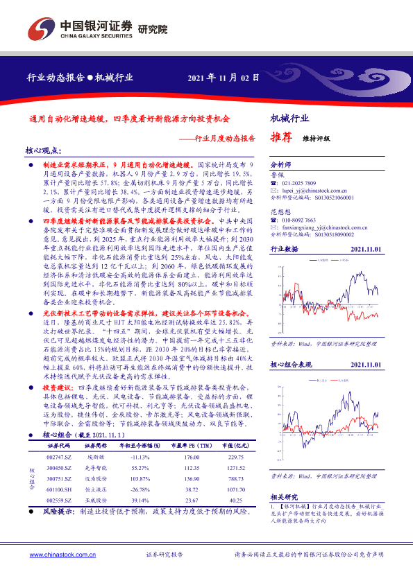 【银河证券】【20211102】机械行业月度动态报告:通用自动化增速趋缓,四季度看好新能源方向投资机会-30页