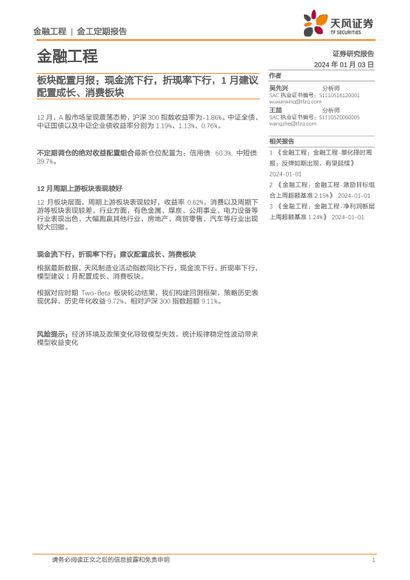 【天风证券】【20240103】板块配置月报:现金流下行,折现率下行,1月建议配置成长、消费板块-10页