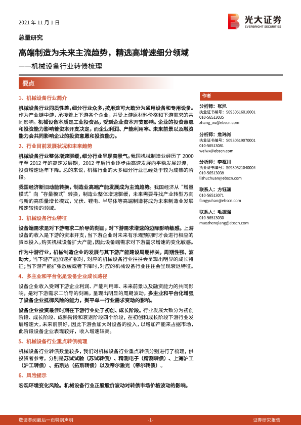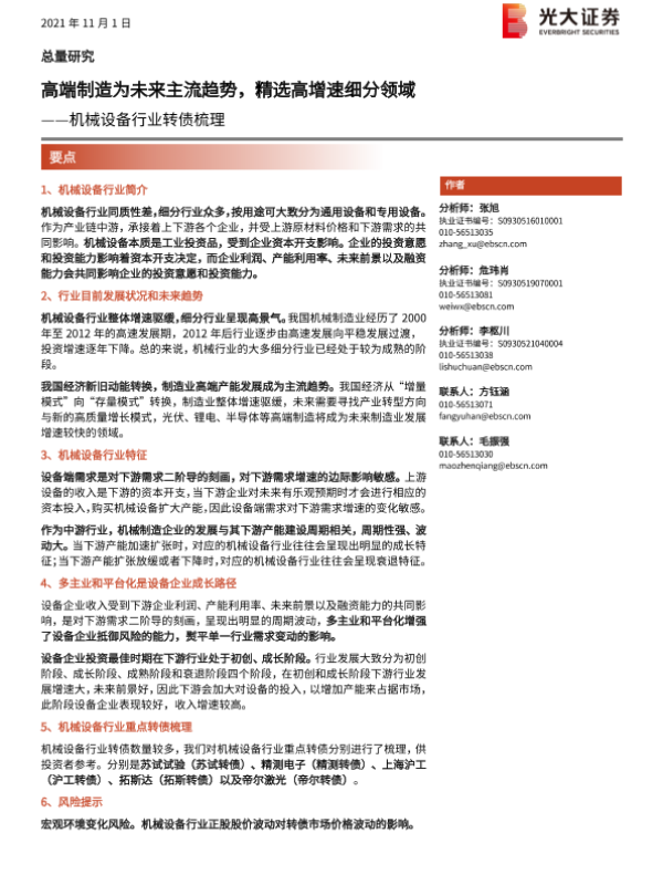【光大证券】【20211101】机械设备行业转债梳理:高端制造成未来主流趋势,精选高增速细分领域-21页