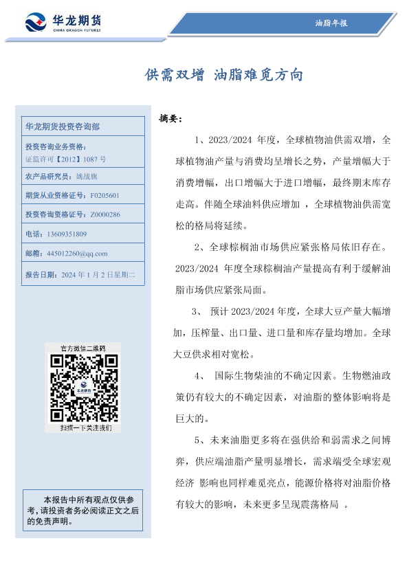 【华龙期货】【20240102】油脂年报:供需双增 油脂难觅方向-19页