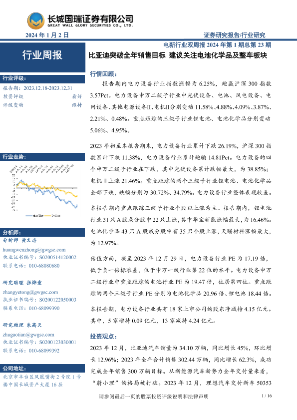 【长城国瑞证券】【20240102】电新行业双周报2024年第1期总第23期:比亚迪突破全年销售目标 建议关注电池化学品及整车板块-16页