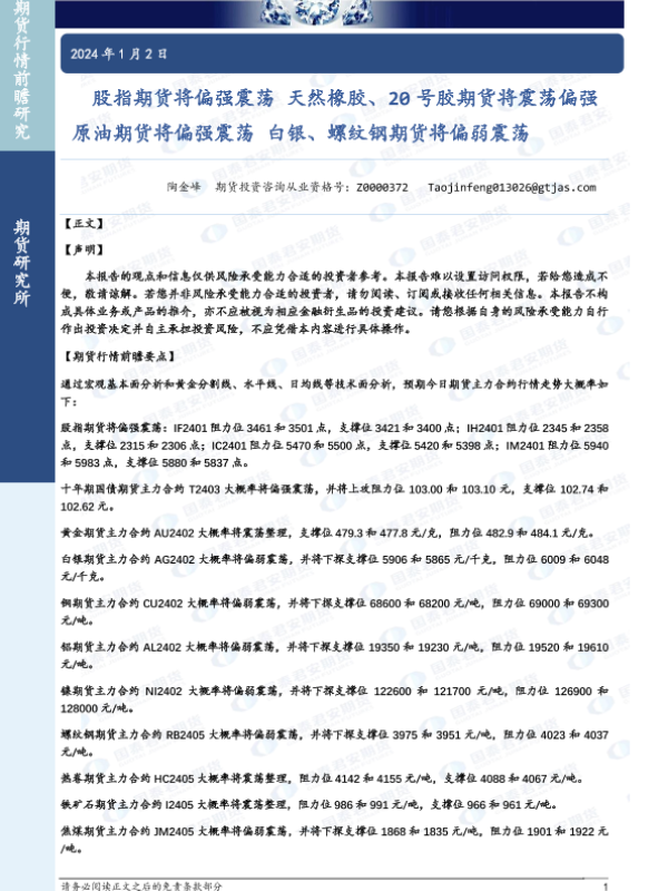 【国泰君安期货】【20240102】股指期货将偏强震荡 天然橡胶、20号胶期货将震荡偏强 原油期货将偏强震荡 白银、螺纹钢期货将偏弱震荡-34页