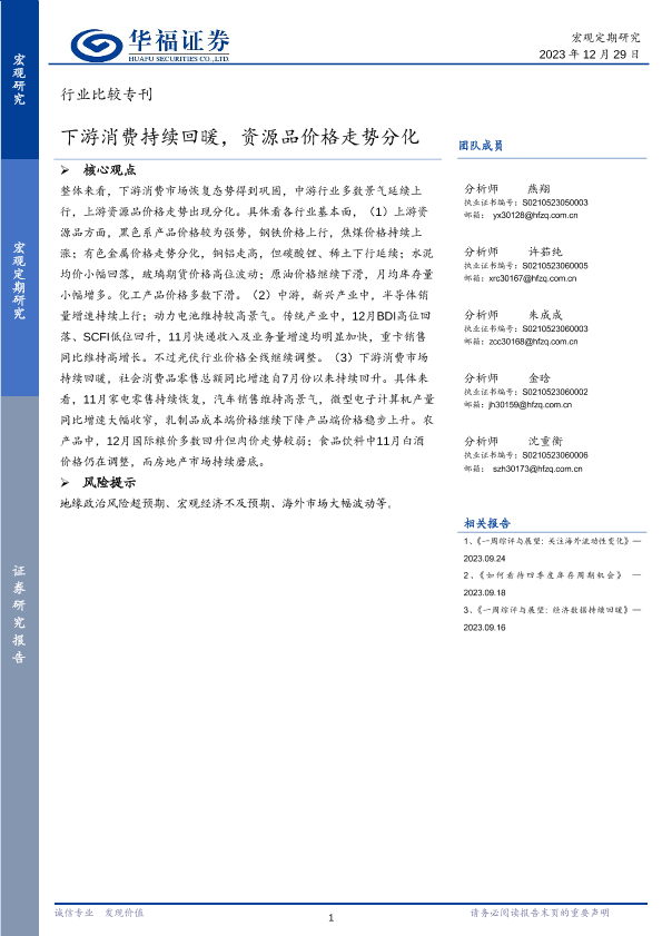 【华福证券】【20231229】行业比较专刊:下游消费持续回暖,资源品价格走势分化-20页