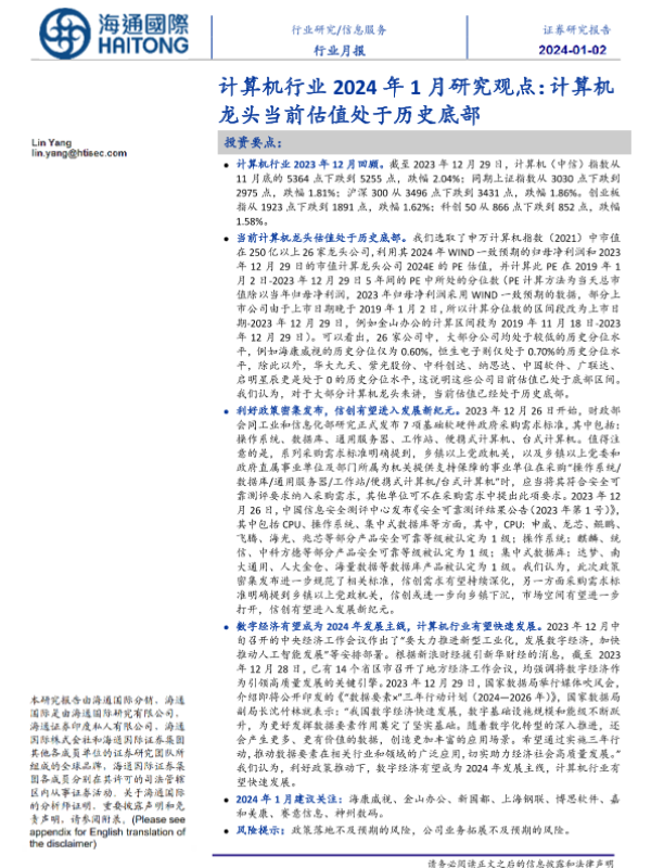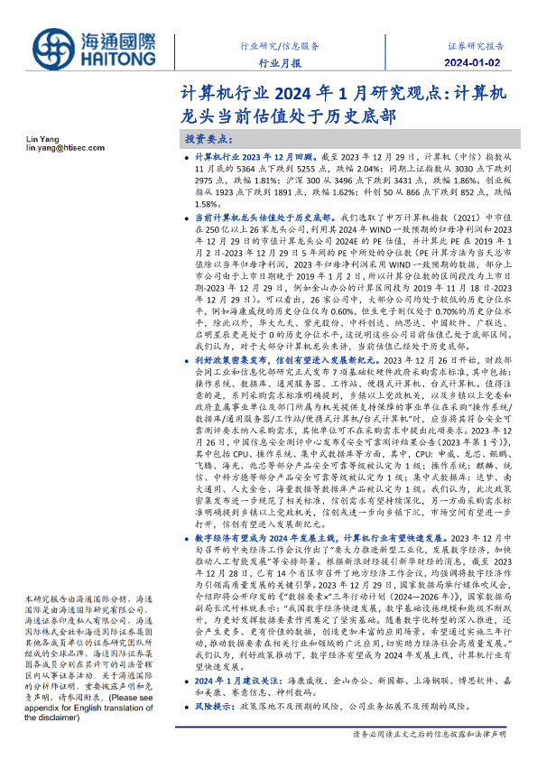 【海通国际】【20240102】计算机行业2024年1月研究观点:计算机龙头当前估值处于历史底部-12页