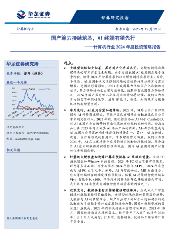 【华龙证券】【20231229】计算机行业2024年度投资策略报告:国产算力持续筑基,AI终端有望先行-36页