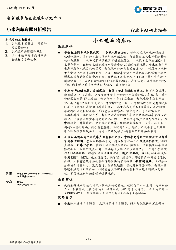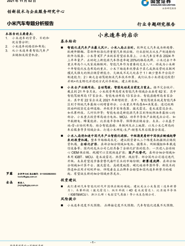 【国金证券】【20211102】汽车行业小米汽车专题分析报告:小米造车的启示-24页