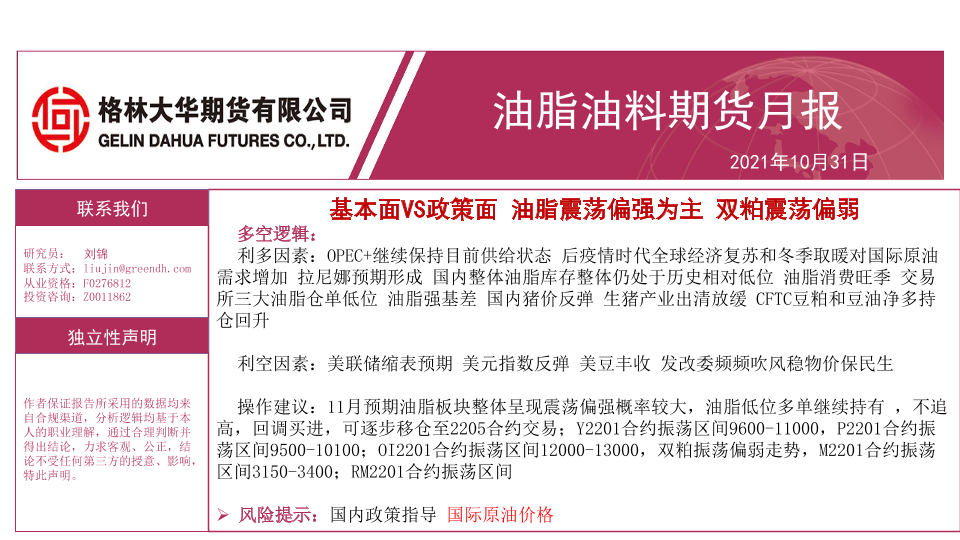 【格林大华期货】【20211031】油脂油料期货月报:基本面VS政策面,油脂震荡偏强为主,双粕震荡偏弱-32页