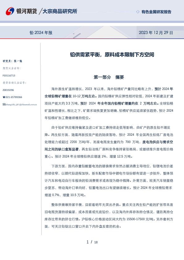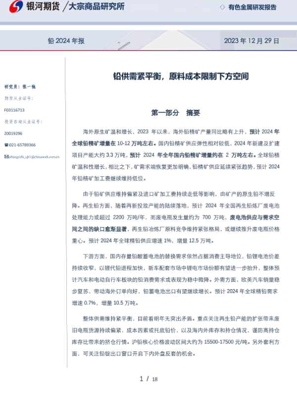 【银河期货】【20231229】铅2024年报:铅供需紧平衡,原料成本限制下方空间-18页