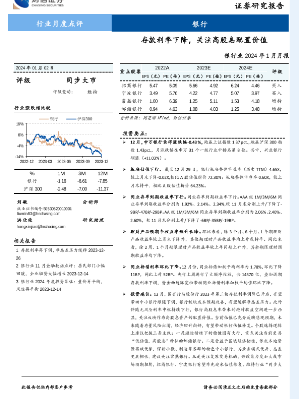 【财信证券】【20240102】银行业2024年1月月报:存款利率下降,关注高股息配置价值-10页