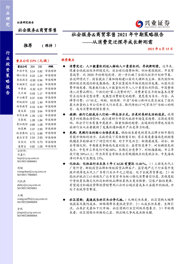 【兴业证券】【20210615】社会服务&商贸零售行业2021年中期策略报告:从消费变迁探寻成长新刚需-117页
