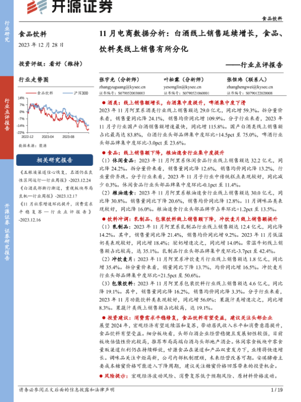 【开源证券】【20231228】食品饮料行业点评报告:11月电商数据分析: 白酒线上销售延续增长,食品、饮料类线上销售有所分化-19页