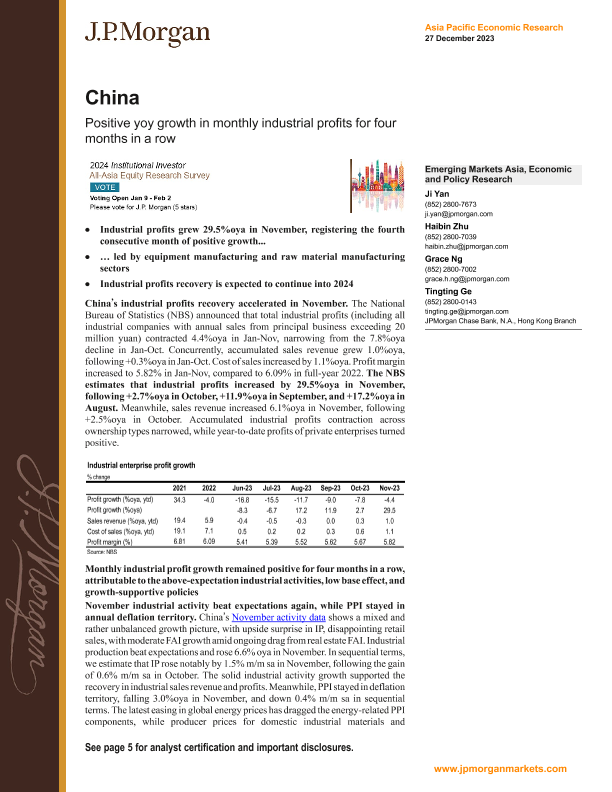 【J.P. Morgan】【20231227】中国工业利润同比增长四个月连续正增长-8页