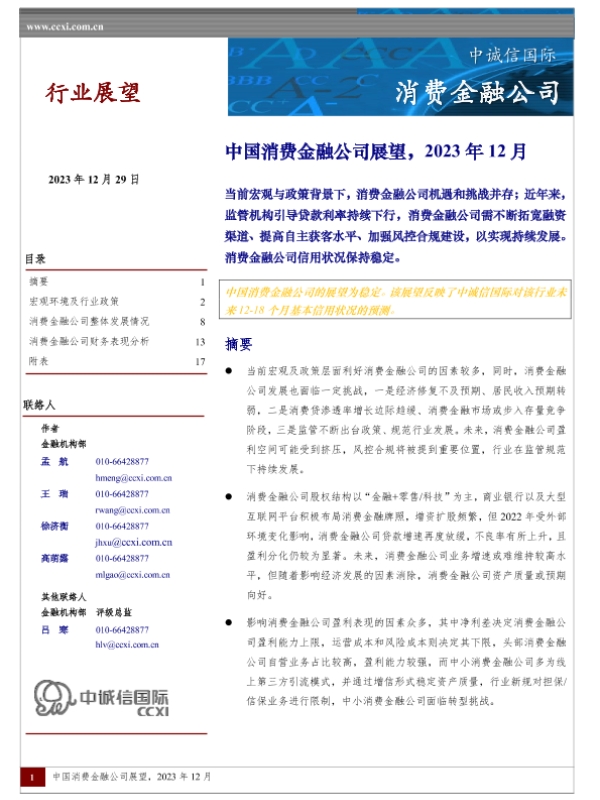【中诚信国际】【20231229】中国消费金融公司展望(2023年12月)-19页
