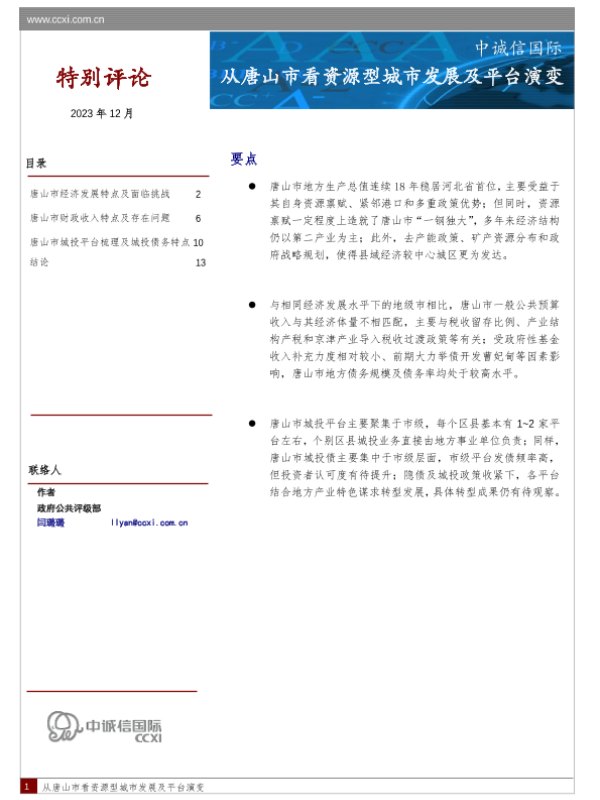 【中诚信国际】【202312】从唐山市看资源型城市发展及平台演变-15页