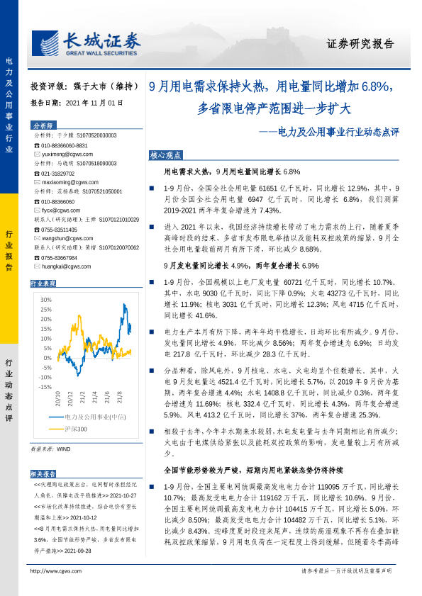 【长城证券】【20211101】电力及公用事业行业动态点评:9月用电需求保持火热,用电量同比增加6.8%,多省限电停产范围进一步扩大-18页