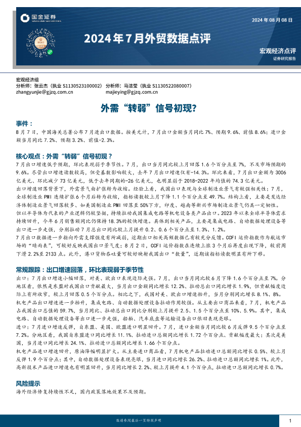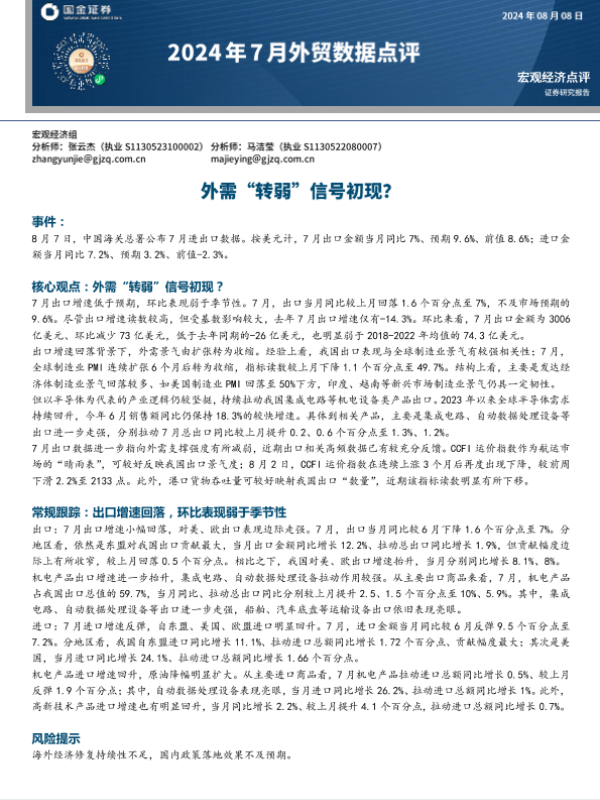 【国金证券】【20240808】2024年7月外贸数据点评:外需“转弱”信号初现?-10页