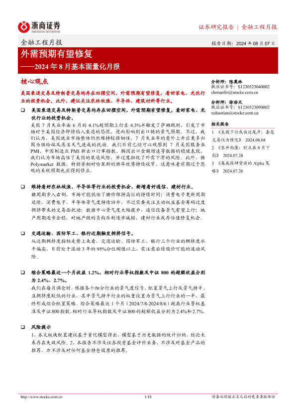 【浙商证券】【20240807】2024年8月基本面量化月报:外需预期有望修复-18页