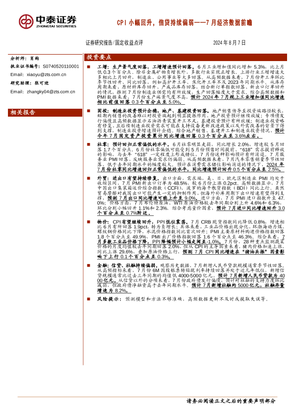 【中泰证券】【20240807】7月经济数据前瞻:CPI小幅回升,信贷持续偏弱-15页