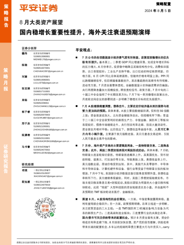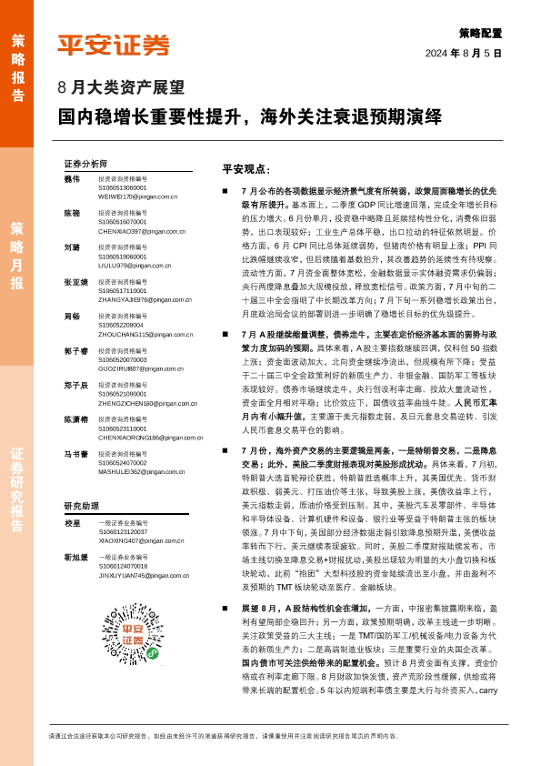 【平安证券】【20240805】8月大类资产展望:国内稳增长重要性提升,海外关注衰退预期演绎-26页