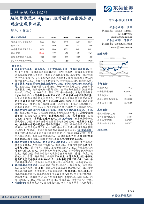 【东吴证券】【20240805】三峰环境(601827)垃圾焚烧技术Alpha:运营领先&出海加速,现金流成长双赢-25页