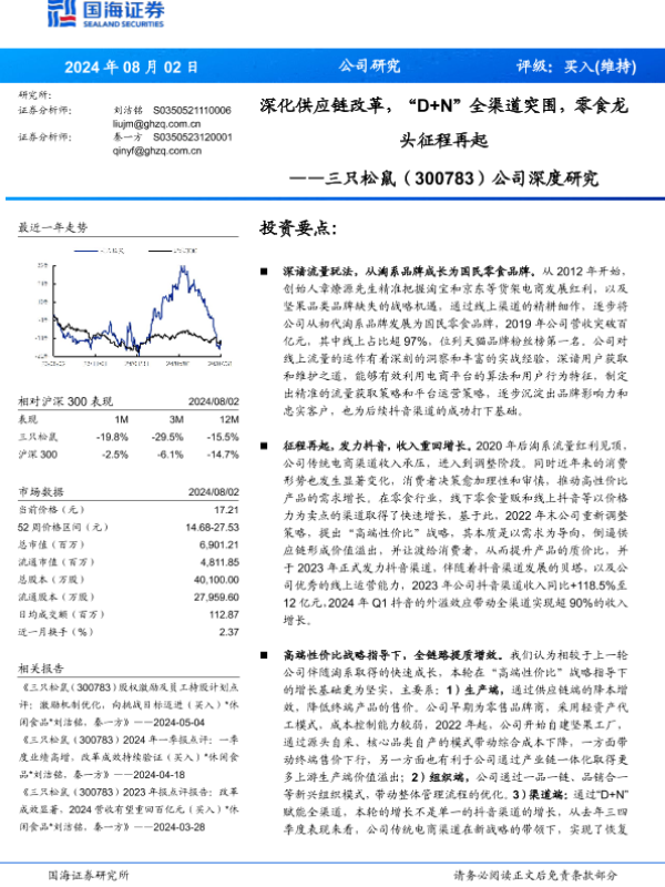 【国海证券】【20240802】三只松鼠(300783)公司深度研究:深化供应链改革,“D+N”全渠道突围,零食龙头征程再起-47页