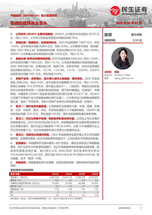 【民生证券】【20240805】中国建筑(601668)首次覆盖报告:稳健的建筑央企龙头-20页