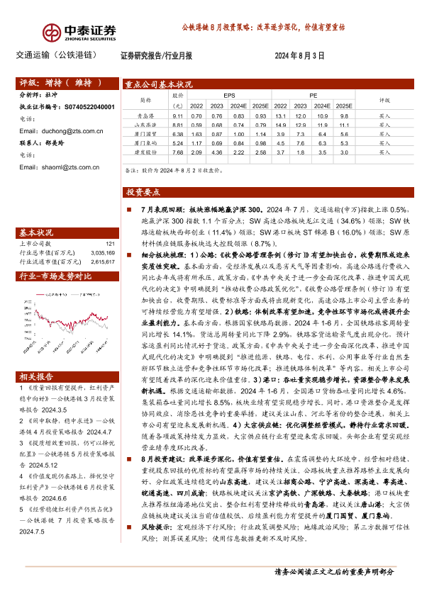 【中泰证券】【20240803】交通运输行业公铁港链8月投资策略:改革逐步深化,价值有望重估-21页