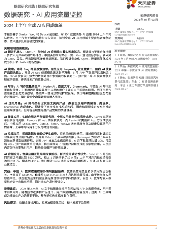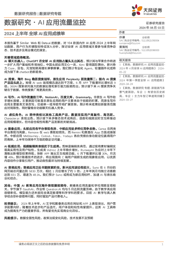 2024上半年 AI应用 全球成绩单 天风证券 流量监控