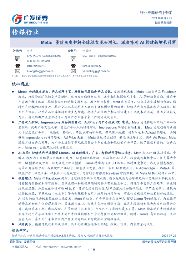 【广发证券】【20240802】传媒行业-Meta:量价角度拆解全球社交龙头增长,深度布局AI构建新增长引擎-38页