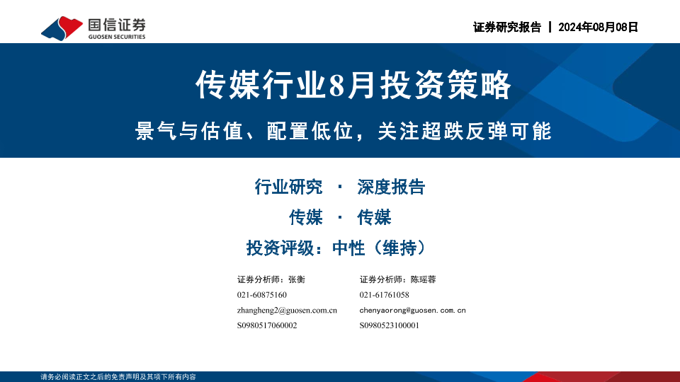 【国信证券】【20240808】传媒行业8月投资策略:景气与估值、配置低位,关注超跌反弹可能-38页