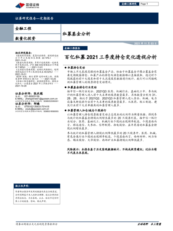 【国信证券】【20211103】私募基金分析:百亿私募2021三季度持仓变化透视分析-16页