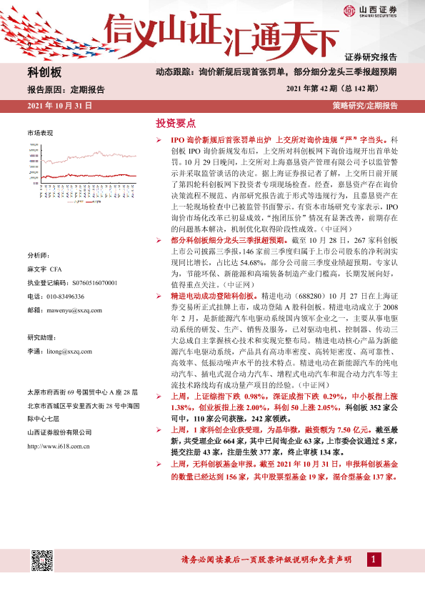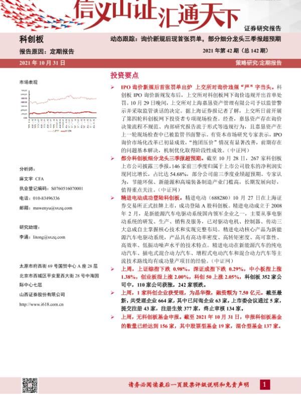 【山西证券】【20211031】科创板动态跟踪2021年第42期(总142期):询价新规后现首张罚单,部分细分龙头三季报超预期-23页