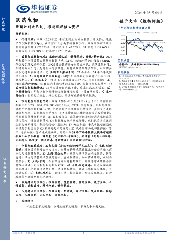 【华福证券】【20240804】医药生物行业定期报告:至暗时刻或已过,布局底部核心资产-16页