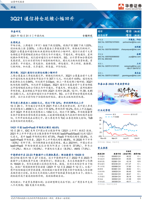 【华泰证券】【20211031】3Q21通信持仓延续小幅回升-24页