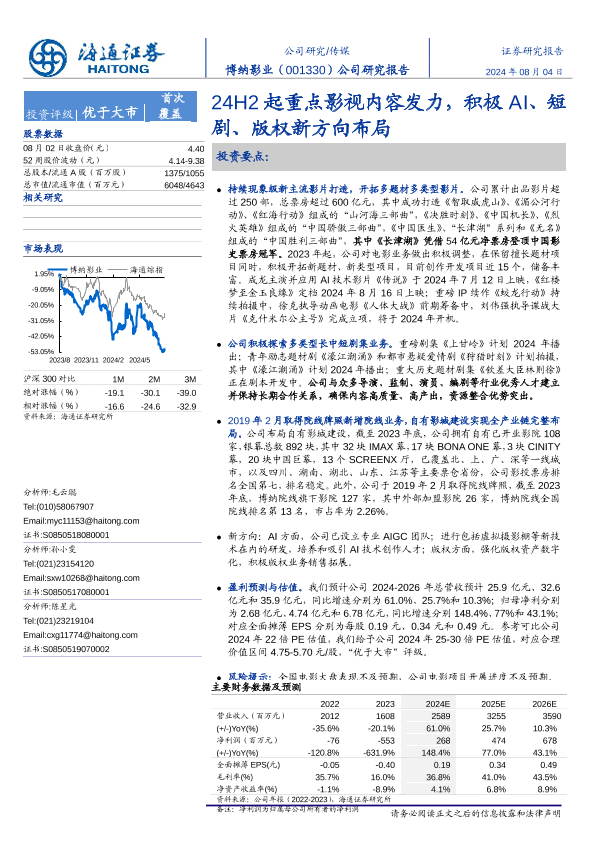 【海通证券】【20240804】博纳影业(001330)公司研究报告:24H2起重点影视内容发力,积极AI、短剧、版权新方向布局-17页