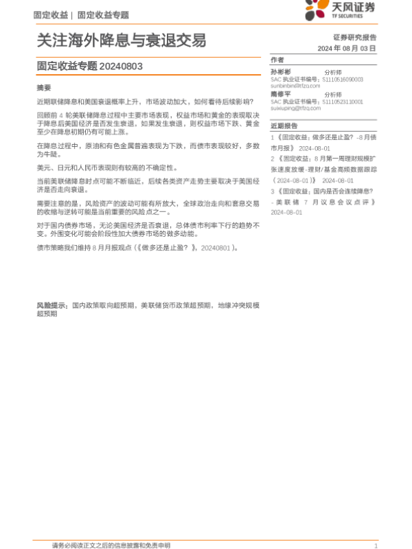 【天风证券】【20240803】固定收益专题:关注海外降息与衰退交易-12页