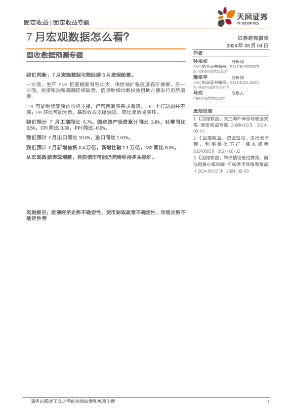 【天风证券】【20240804】固收数据预测专题:7月宏观数据怎么看?-19页