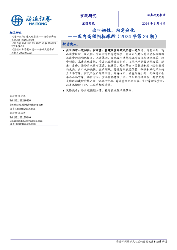 【海通证券】【20240804】国内高频指标跟踪(2024年第29期):出口韧性,内需分化-12页
