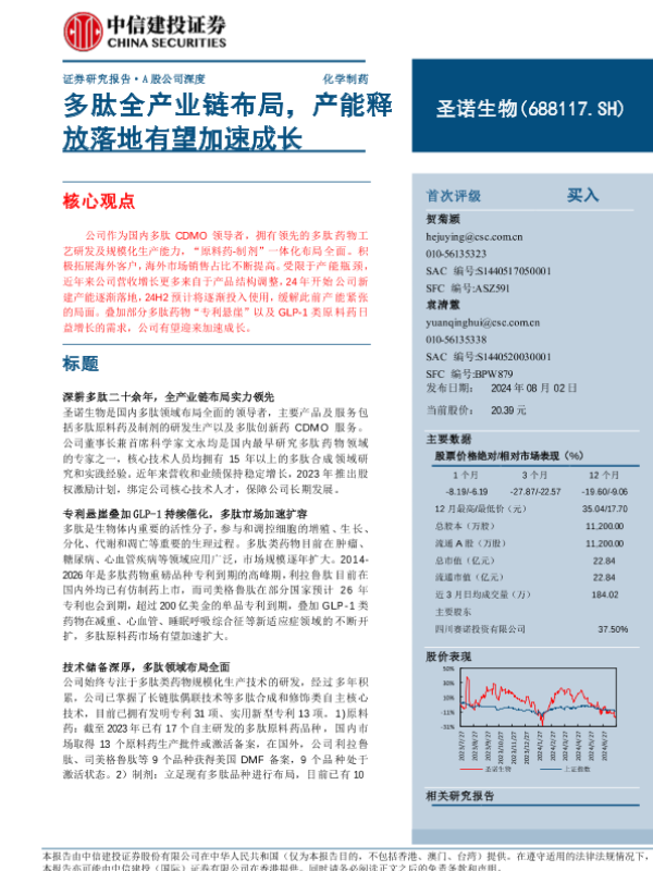 【中信建投证券】【20240802】圣诺生物(688117)多肽全产业链布局,产能释放落地有望加速成长-29页