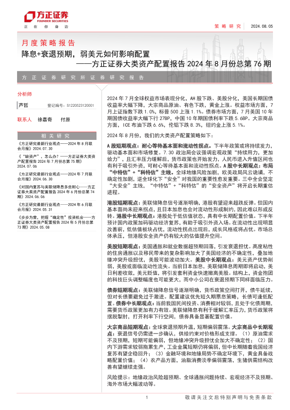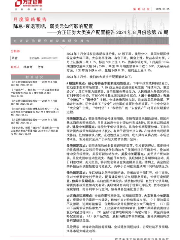 【方正证券】【20240805】大类资产配置报告2024年8月份总第76期:降息+衰退预期,弱美元如何影响配置-27页