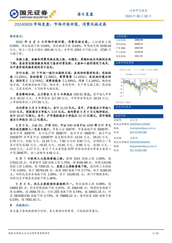 【国元证券】【20240808】20240808市场复盘:市场冲高回落,消费风格走高-12页