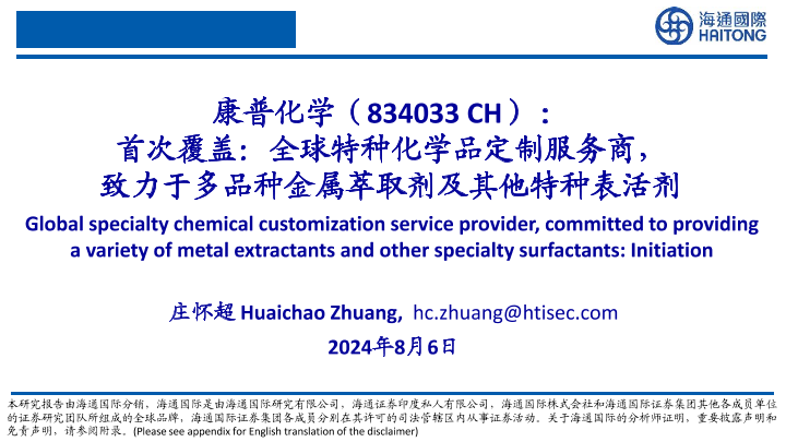 【海通国际】【20240806】康普化学(834033)首次覆盖:全球特种化学品定制服务商,致力于多品种金属萃取剂及其他特种表活剂-45页